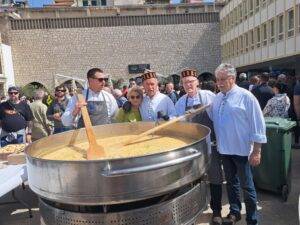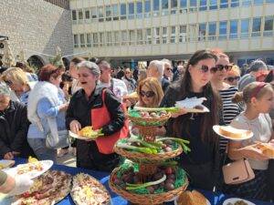 -Pripremili smo hranu za tisuću i po ljudi. Ima šunke, pancete, kapulice, razne suhomesnate delicije. U fritaji je i 70 kilograma šparoga, 50 kilograma pancete i 30 kilograma kapule – kaže Smolić, koji je, u ime 2400 obrtnika grada Šibenika svima okupljenima čestitao Uskrs.