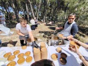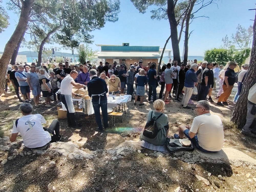 Na tri lokacije u šumi grah su dijelili gradonačelnik Šibenika Željko Burić, njegov zamjenik Danijel Mileta, gradski pročelnik i predsjednik Gradske četvrti Jadrija Joško Jurić te direktor Turističke zajednice grada Šibenika Dino Karađole. Bez ikakve gužve tri su reda brzo tekla, ali su se i ‘manjerke’ s grahom još brže praznile. Za utjehu onima koji nisu ručali, ostaje nezaobilazni desert ‘Rušijeve krafne’.