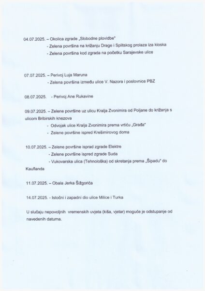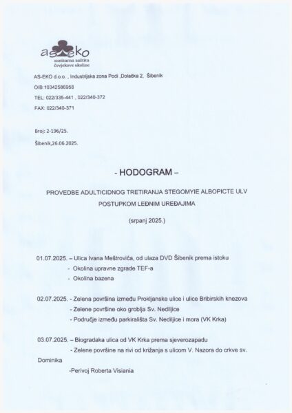 Djelatnici tvrtke ‘As-eko’ Šibenik provest će, prema priloženom rasporedu, adulticidno tretiranje komaraca (zamagljivanje ULV postupkom) na području grada Šibenika od 1. do 14. srpnja 2025. godine. U slučaju nepovoljnih meteoroloških okolnosti, zamagljivanje će se provesti kada se vremenske prilike poboljšaju.