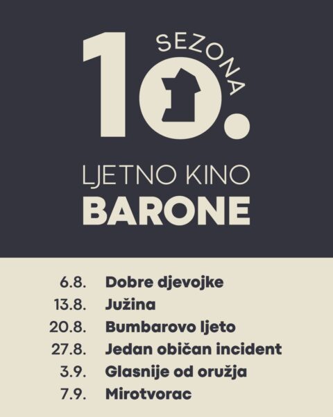 Ljetno kino Barone 13. 8. očekuje poslastica ljeta – projekcija filma Južina splitskog redatelja i scenarista Ante Marina uz gostovanje brojnih filmskih ekipa. Marinov cjelovečernji debi otvorio je 72. Pulski filmski festival i oduševio autentičnom atmosferom juga. Ova crna komedija smještena je u splitsku četverokatnicu u kojoj, dok jugo potrese grad, pratimo isprepletene živote niza običnih likova koji, igrom slučaja, završe u ludim situacijama, a glavne uloge tumače redom izvrsni Snježana Sinov č i ć -Šiškov , Donat Zeko i Stojan Matavulj . Južina je u Puli osvojila Nagradu Kino mreže kao poticaj za kinodistribuciju, riječima samog redatelja, „atmosfera juga je kao i ovaj film, pomaknuta i humorna, nervozna i napeta, dramatična i emocionalna te u konačnici eksplodiranja“.
