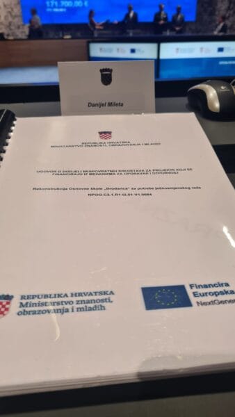 U Ministarstvu znanosti, obrazovanja i mladih danas je šibenskom dogradonačelniku Danijelu Miletu uručen ugovor za rekonstrukciju Osnovne škole Brodarice vrijedan 4.124.142,22 eura.