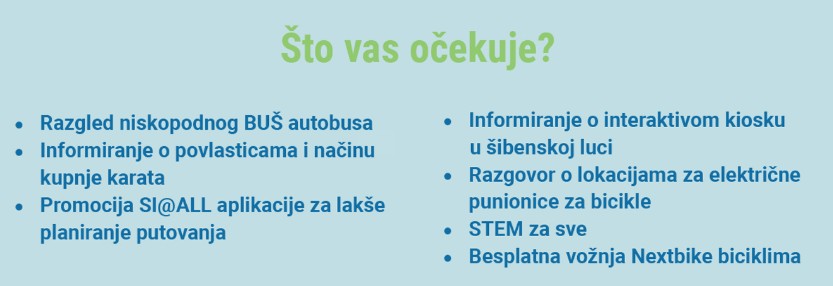 Prilika je to za informirati se o javnom prijevozu, novim šibenskim autobusima i njihovoj pristupačnosti, MaaS aplikaciji i informativnom kiosku u luci, ali i postavljati pitanja te dati prijedloge za unaprijeđenje. Događanje organiziraju Grad Šibenik, Gradski parking, ODRAZ i Kolektiv 4B.