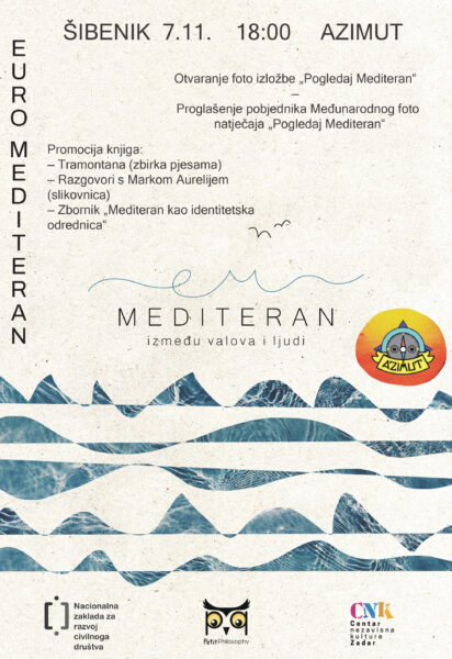 Ovog petka, u sklopu projekta „Mediteran – između valova i ljudi“, u galeriji Azimut u 18 sati održat će se otvaranje izložbe najboljih fotografija međunarodnog foto natječaja „Pogledaj Mediteran“ uz proglašenje nagrađenih autora te promociju triju knjiga mediteranske tematike (Filip Škifić – Tramontana, Denis Bobanović – Razgovori s Markom Aurelijem i Zbornik Mediteran kao identitetska odrednica),  uz prigodan domjenak. Izložba će biti otvorena za sve posjetitelje do četvrtka, 13. studenog.