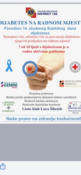 Lions klub Luca, u suradnji sa županijskim Zavodom za javno zdravstvo, Crvenim križem Šibenik i Medicinskom školom, u povodu Međunarodnog dana šećerne bolesti organizira javnozdravstvenu akciju besplatnog mjerenja glukoze u krvi i krvnog tlaka, a osigurani su i promotivni materijali o prevenciji dijabetesa i preporukama prehrane. Akcija će na Poljani biti organizirana na Poljani, kod Kazališta u petak, 14. studenoga od 10 do 12 sati. Luce zahvaljuju Poliklinici Gemini Šibenik koja im je donirala aparata za mjerenje glukoze, trakica i promotivne materijala s preporukama prehrane .