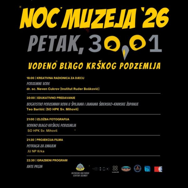 U okviru Noći muzeja u petak 30. siječnja, Nezavisni kulturni centar Azimut, u suradnji s Hrvatskim planinarskim klubom Sv. Mihovil Speleološki odsjek, JU Nacionalni park Krka i Institutom Ruđer Bošković, predstavlja program “Vodeno blago krškog podzemlja”. U tijeku su i prijave najmlađih sudionika na dječju radionicu pod vodstvom vrsnog stručnjaka. Sav program je besplatan za sve sudionike.
