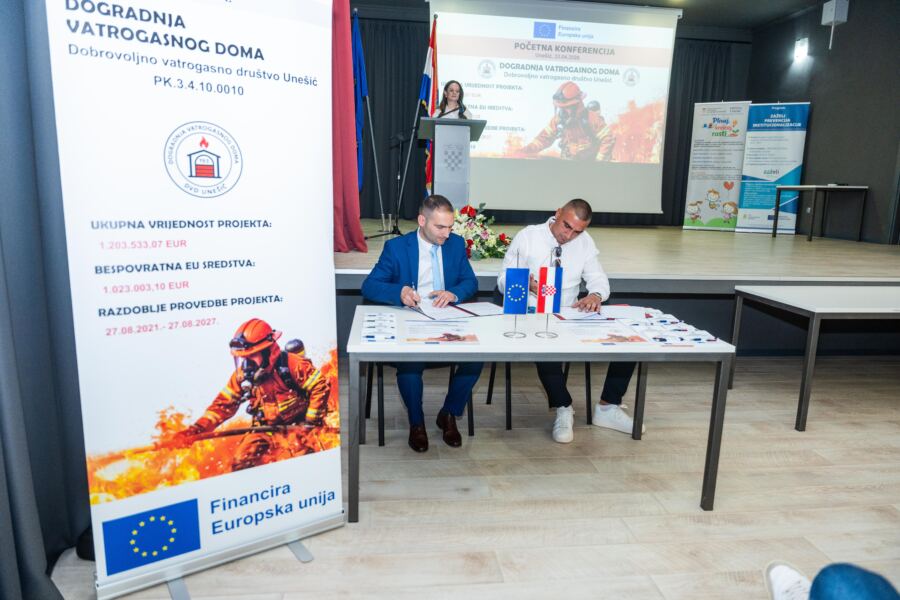 Na Početnoj konferenciji projekta potpisan je Ugovor sa izvođačem radova, tvrtkom SALADO. Ugovor o dogradnji vatrogasnog doma DVD-a Unešić potpisali su načelnik Općine Unešić Marko Parat i odgovorna osoba društva SALADO Juraj Pavlović. Potpisivanju ugovora nazočio je i župan Šibensko-kninski Paško Rakić, zapovjednik Vatrogasne zajednice Šibensko kninske županije Darko Dukić, zapovjednik DVD-a Unešić Josip Bulat i drugi uzvanici.