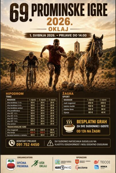 Tradicionalne 68. Prominske igre održati će se na Praznik rada, u petak 1. svibnja. Prijave za natjecatelje otvorene su do 14 sati, a organizatori su Općina Promina i DŠR Oklaj. Program će se odvijati na hipodromu i na Žagri, a sudionike očekuje niz sportskih disciplina i tradicionalnih natjecanja.