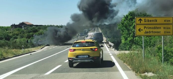 Požar na vozilu, koje je u potpunosti izgorjelo, su ugasili vatrogasci JVP Šibenik.