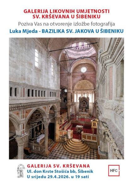 Izložbom fotografija ‘Bazilika svetog Jakova u Šibeniku’ u Galeriji svetog Krševana predstavit će se Luka Mjeda. Otvaranje izložbe je u srijedu, 29. travnja u 19 sati, a moći će se razgledati do 30. svibnja, svaki radni dan 11-13 i 17-19 sati te subotom od 9 do 12 sati.